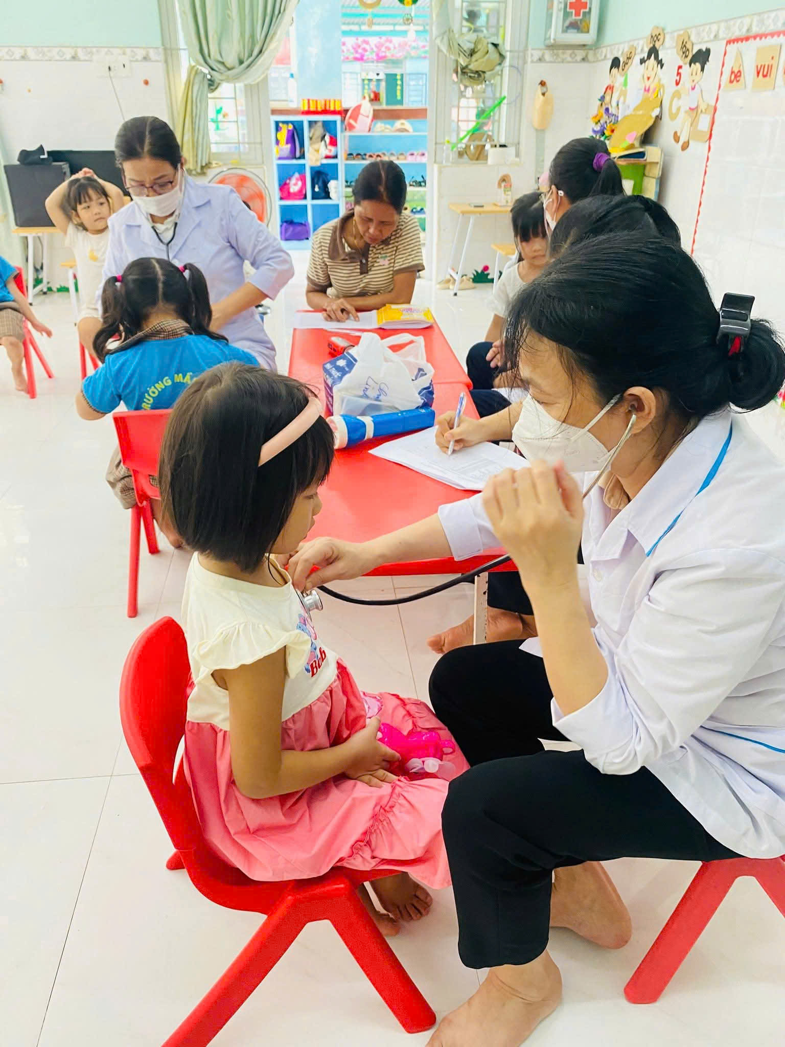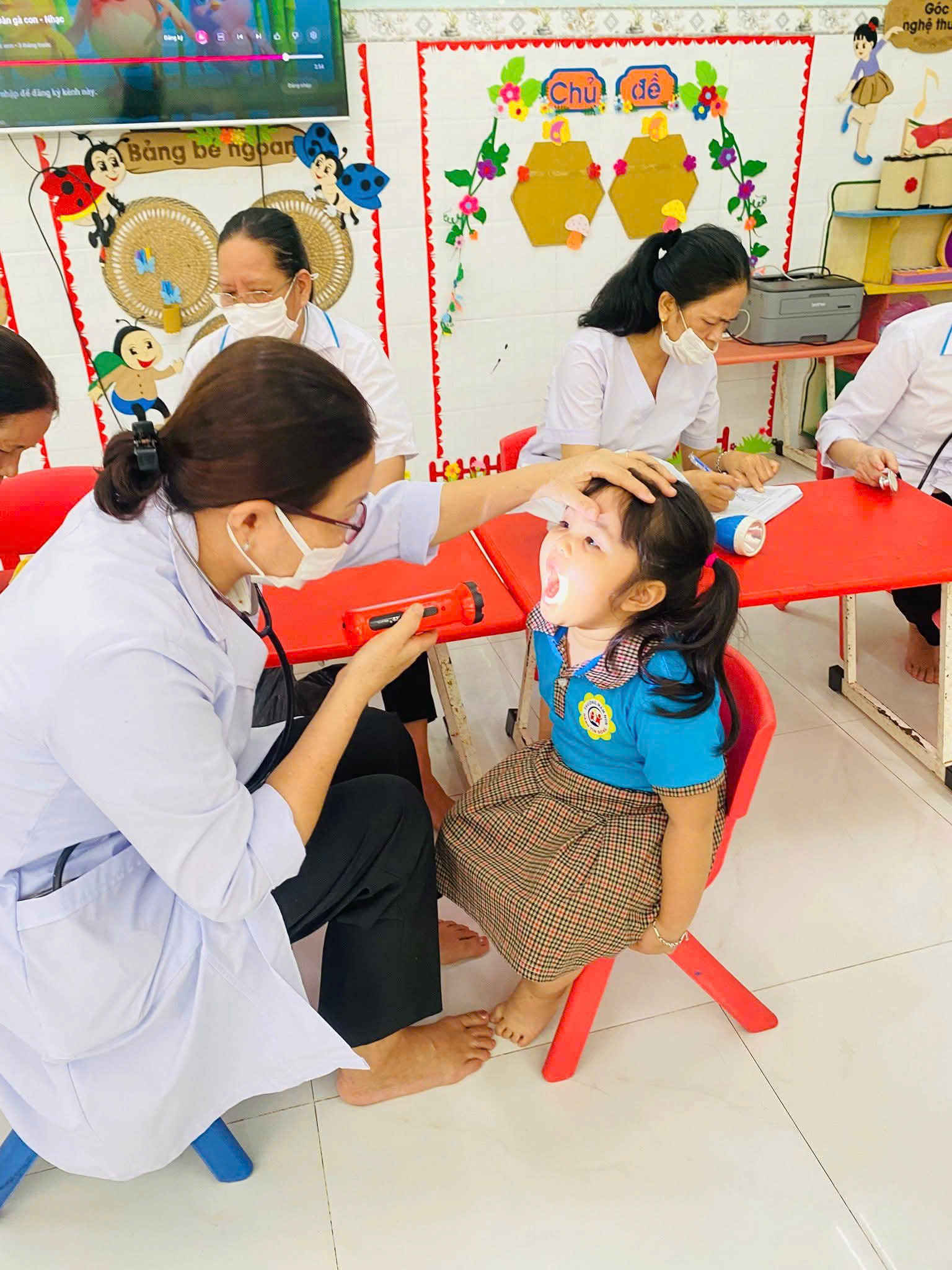 Từ đó bác sĩ sẽ tư vấn cho giáo viên và phụ huynh cách chăm sóc sức khỏe cho từng bé. Trong buổi khám sức khỏe, trẻ sẽ được đo cân nặng, chiều cao, khám tai, mũi, họng, kiểm tra tim phổi và một số bệnh thường gặp liên quan tới đường hô hấp, da liễu và cũng qua hoạt động này đã đem lại sự phấn khởi, tin tưởng trong các bậc phụ huynh về một môi trường giáo dục an toàn và thân thiện.